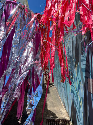 A Dark Horse Projects collaboration. Jill O'Meehan and Serena McLauchlan joined forces to create 'Glitterati Parti' a lane way installation for the 2020 Albany Christmas Festival. Twenty-four hand made Chandeliers from recycled and reclaimed materials adorn the otherwise unused lane way. These pieces aim to activate the space with joy and imbue festive spirit in movement and wonder.
