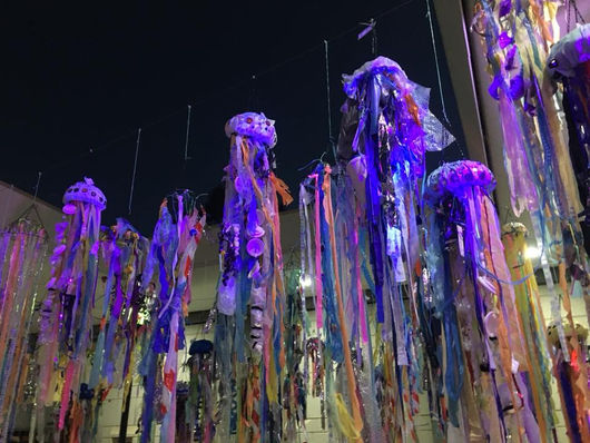 Melville City Council 2017 Merge Festival was billed as "A one off collision of art, stories, street performance, music, food, markets and spectacle". I was invited to work with local primary school students to create a swarm of Swan River Jellyfish made from recycled materials, these were then suspended in the courtyard of the Civic Square.