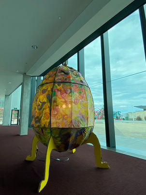 Creating our version of the luxurious Faberge Egg with its own hidden secrets within. After dark, moving shadow play of Australian native animals come alive. Installed at the Albany Entertainment Centre in collaboration with Serena McLauchlan, Dark Horse Projects and Albany Men's Shed, Easter 2021. Timber, painted textiles and light projection.