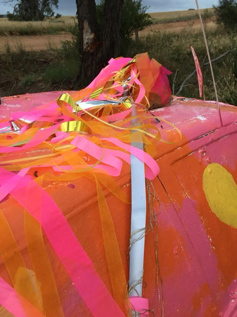 An evolving piece of rural road art located in Borden in the beautiful South West of WA. A car came off the road (no one was hurt) and subsequently abandoned to become a feature of this loose gravel corner and a local landmark. It is now held together by many layers of paint and with each iteration becomes a talking point for the local farming community.
